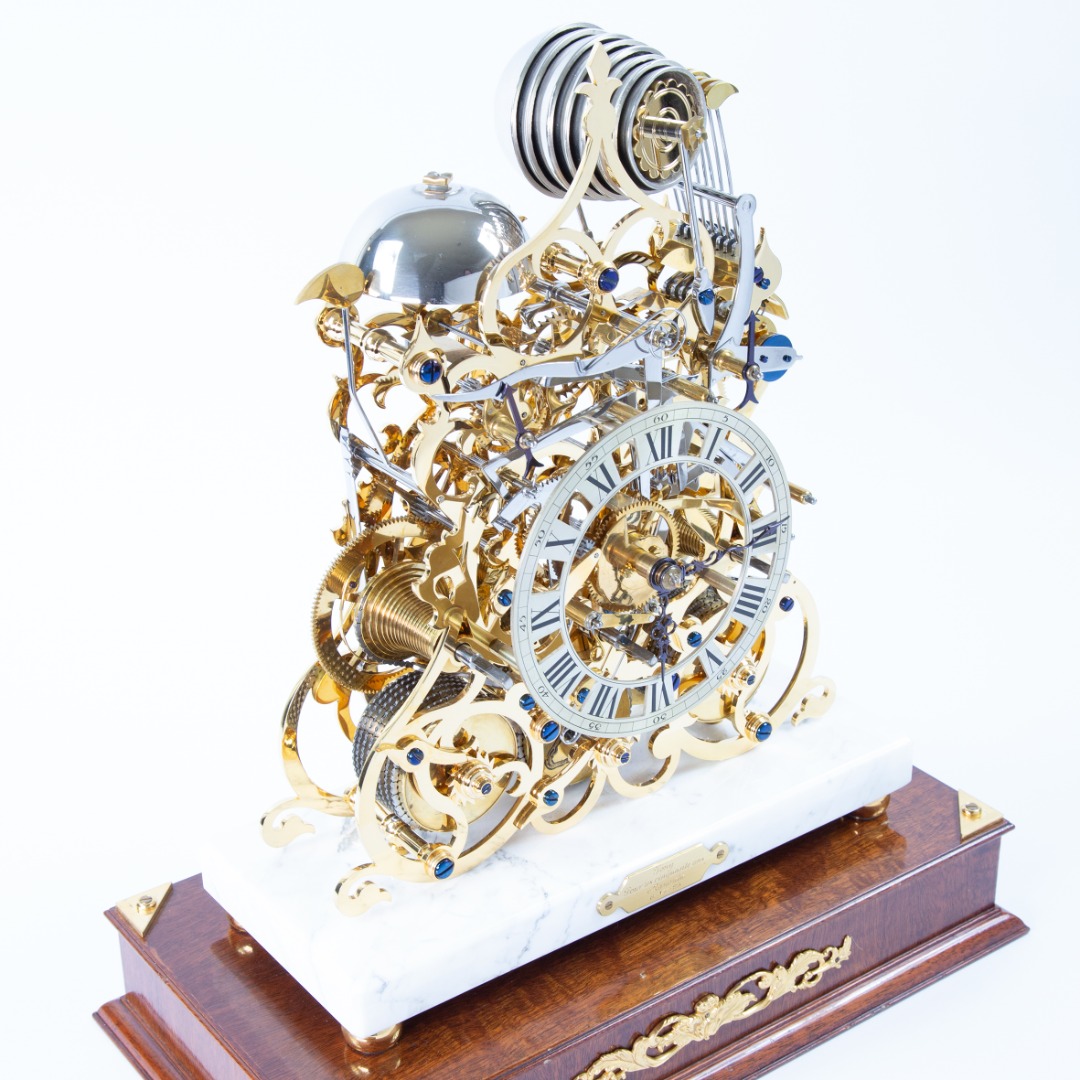 This magnificent chiming Skeleton Clock is the result of months of painstaking hand work. Each plate is individually cut out of solid brass, edge filed, papered smooth, burnished, and gilded before being built into the finished clock. Originally made in 1995, this was the last Three Train Skeleton clock that Mike Harding worked on.