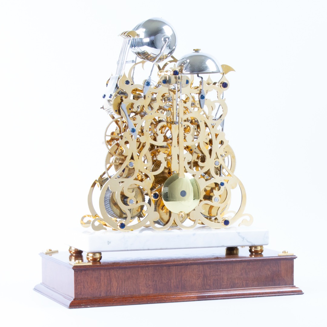 The plates are finished in gold the internal movement is polished brass. The movement has an 8-day power reserve.The chime train operates a pinned drum and hammer assembly which can be set to play Westminster or a choice of Whittington and St Michael chimes on an octave of bells from John Taylor Bell Founders, whilst the striking train sounds the hours on a ninth tenor bell.The movement is sat on a Bianca Carrera marble plinth, placed on a mahogany base. The marble base has a personalised plaque, this can be replaced with a new inscription for the new owner. The glass shade has four winding/handsetter holes at the front (not shown).The clock will have a full service by Sinclair Harding (full strip, clean and re-oil) before being sold to a new owner.