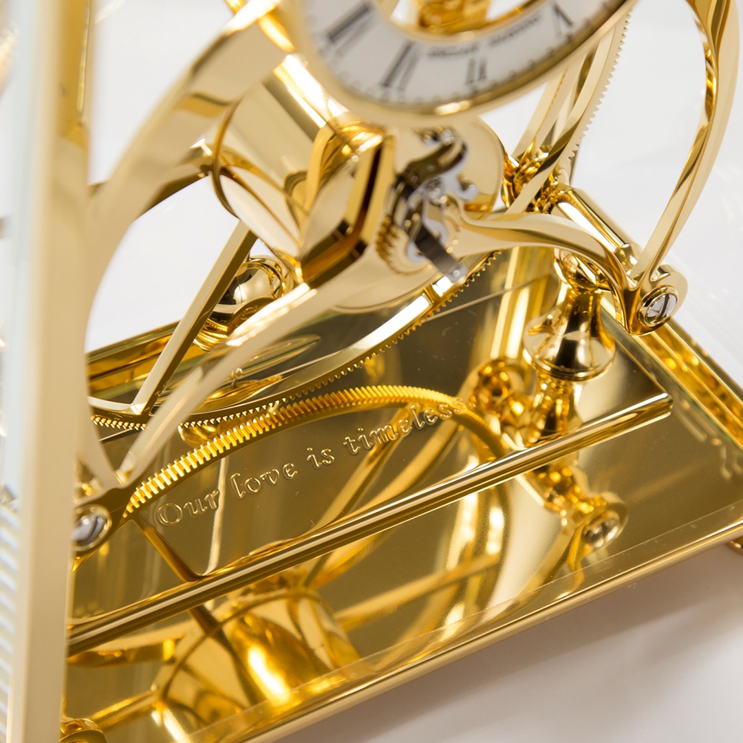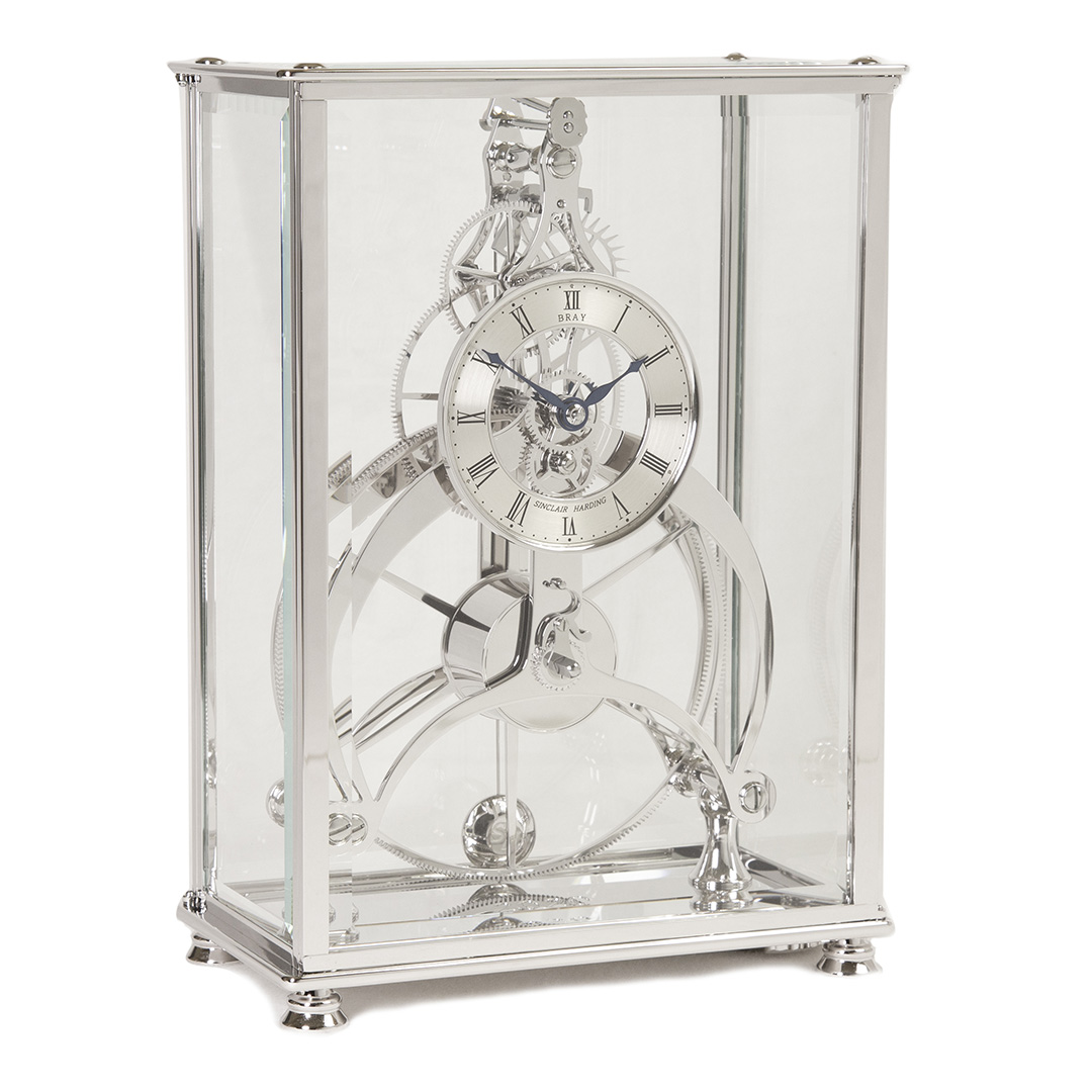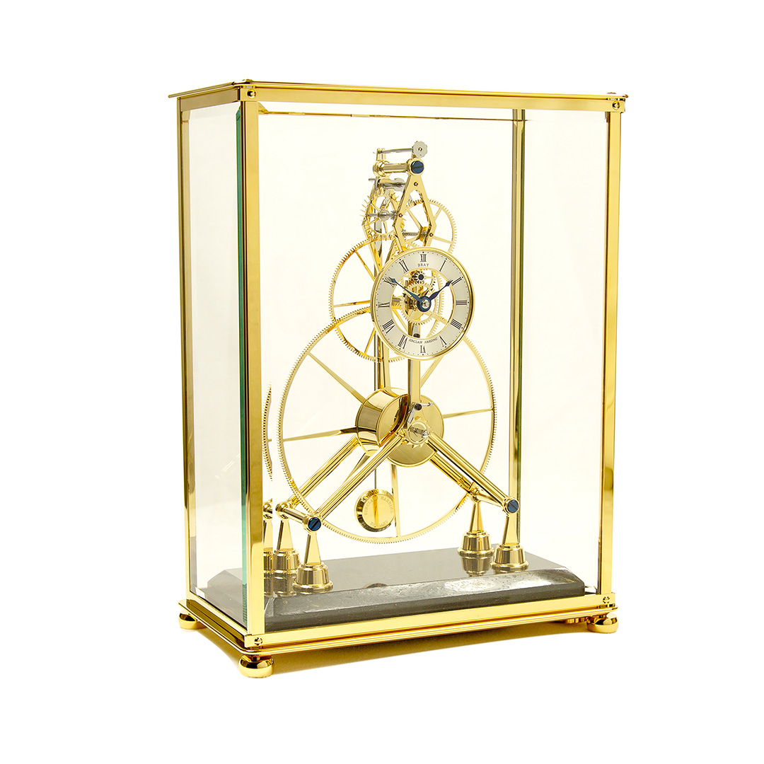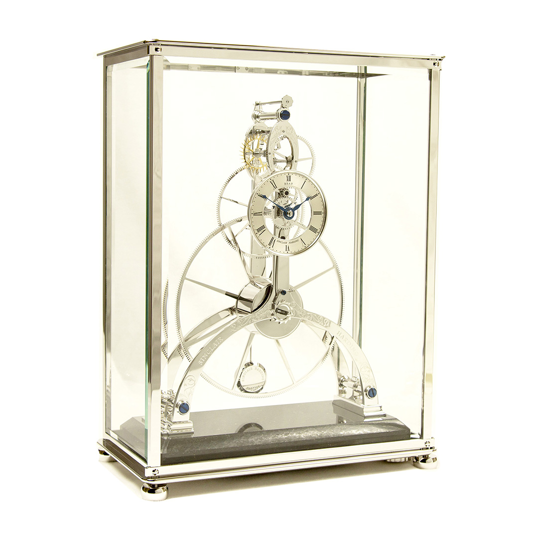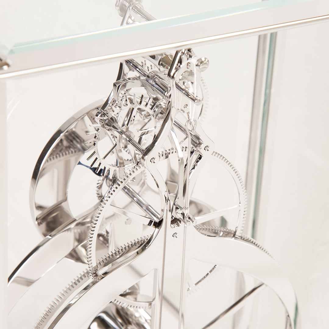 The frames, pierced out of solid Brass, are gracefully faceted, polished, and burnished to provide a gleaming support for the four-wheel train. The Great Wheel has 288 teeth and makes only one revolution daily. This drives the centre wheel with a diameter slightly larger than the bezel, thus, when viewed from the front, frames the silvered dial.